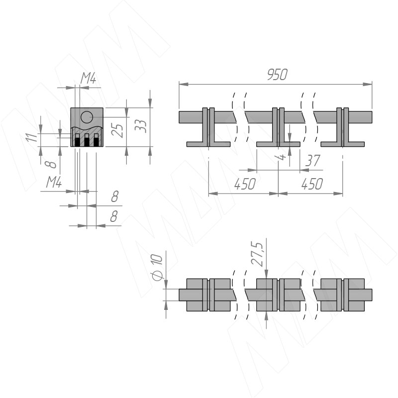 Размеры ручки-рейлинга с межцентровым расстоянием 450/900 мм (артикул WMN.906.900)
