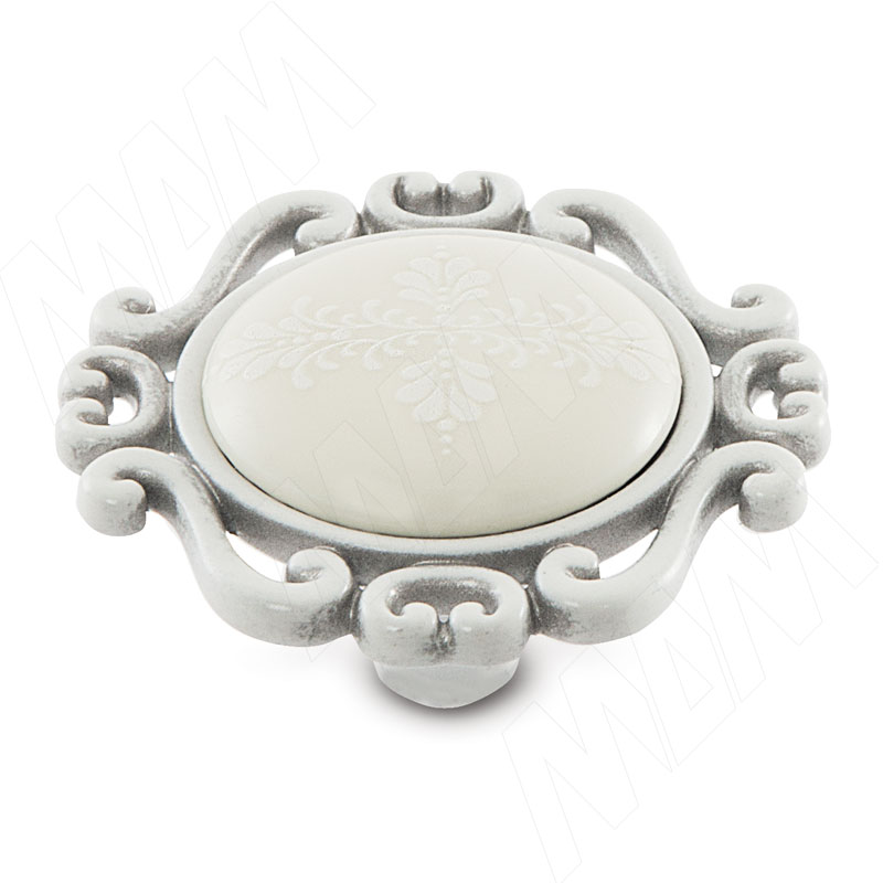 Ручка-кнопка белый/серебро винтаж, керамика белые узоры