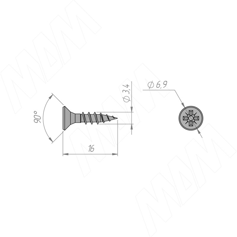 Размер самореза 3,5x16 мм с потайной головкой под крест (артикул CHS 3,5 X 16 NK MP) Диаметр намёточного отверстия — 2,5 мм.
