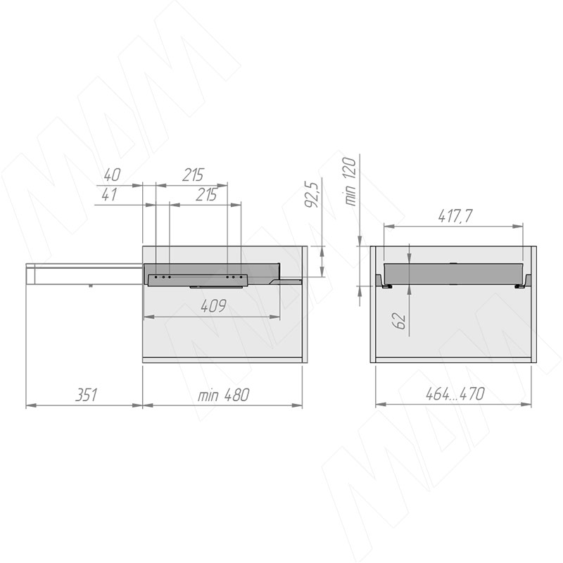 Размеры выдвижного органайзера ESENTA с плавным закрыванием для аксессуаров  в корпус шириной 500 мм (артикул ES50OR), схема 1 Размеры выдвижного органайзера ESENTA с плавным закрыванием для аксессуаров  в корпус шириной 500 мм (артикул ES50OR)