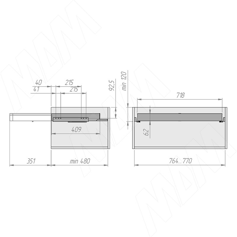 Установка выдвижного органайзера ESENTA с плавным закрыванием для аксессуаров  в корпус шириной 800 мм (артикул ES80OR), схема 1 Размеры выдвижного органайзера ESENTA с плавным закрыванием для аксессуаров  в корпус шириной 800 мм (артикул ES80OR)