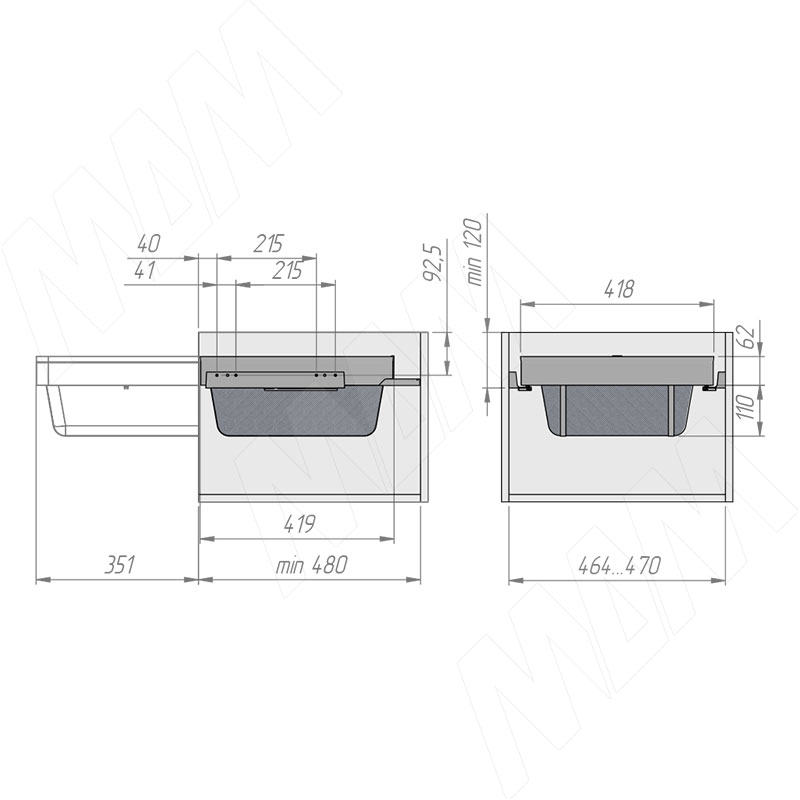 Установка выдвижной корзины ESENTA с плавным закрыванием для белья в корпус шириной 500 мм (артикул ES50BA), схема 1Установка выдвижной корзины ESENTA с плавным закрыванием для белья в корпус шириной 500 мм (артикул ES50BA), схема 2