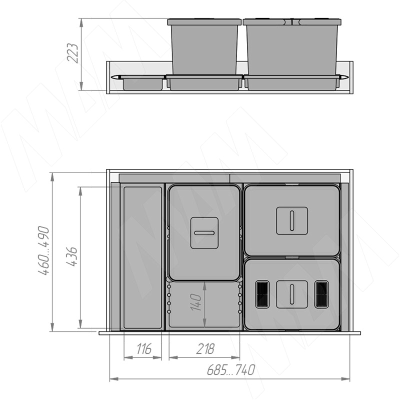 • лоток имеет дополнительные мягкие уплотнители для фиксации в ящиках любых типов и дополнительные съёмные разделители для организации пространства лотка и фиксации ведра от перемещения;