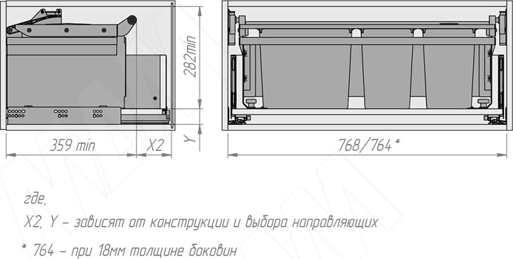 Установка системы MOVEBIN M80A для сортировки мусора и хранения, 3 емкости (16,5л+10л+10л), установка в ящик, автоматическая крышка (артикул MVB080AGM), схема 1 Установка системы MOVEBIN M80A для сортировки мусора и хранения, 3 емкости (16,5л+10л+10л), установка в ящик, автоматическая крышка (артикул MVB080AGM), схема 2