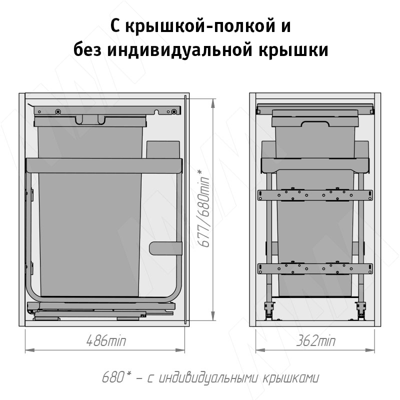 Установка системы KOMBI 2.0 M40W для фасадов шириной от 400 мм с 1 ведром с крышкой-полкой для сортировки и хранения (артикул KOMBI2GME401ASCGMRF), схема 2