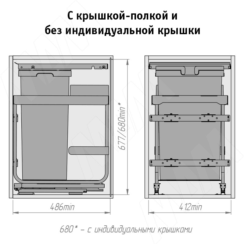 Установка системы KOMBI 2.0 M45W для фасадов шириной от 450 мм с 1 ведром с крышкой-полкой для сортировки и хранения (артикул KOMBI2GME451ASCGMRF), схема 2
