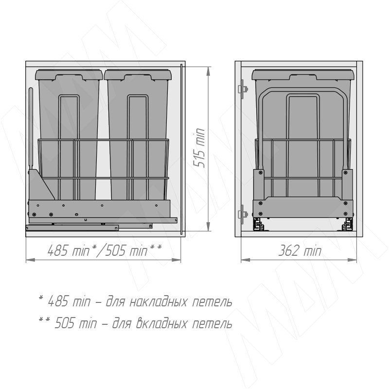 Комплектация: комплект рамы (платформы) — 1 шт., ведро с рамкой для пакета, ручками и индивидуальной крышкой — 2 компл., ручка для выдвижения — 1 компл., направляющие — 1 компл.