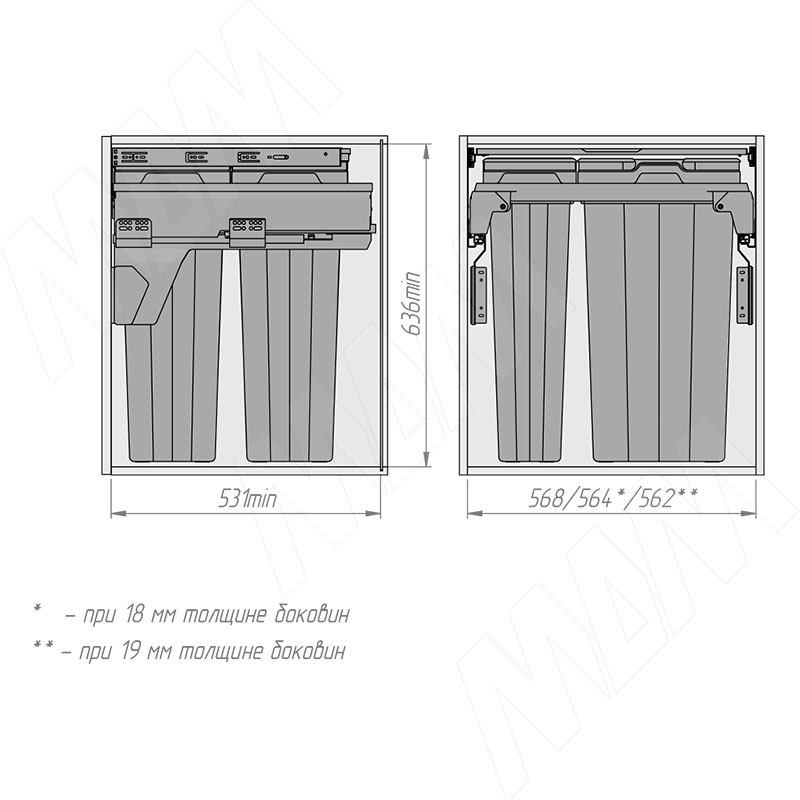 Установка системы PROBOX MAX F60 для сортировки и хранения, 4 емкости (2x16 л + 2x31 л), для фасадов шириной 600 мм (артикул MBN604-94DGMAX), схема 2