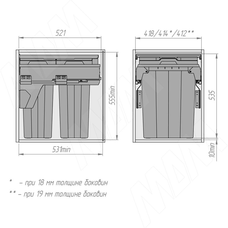 * — при толщине боковин 18 мм
