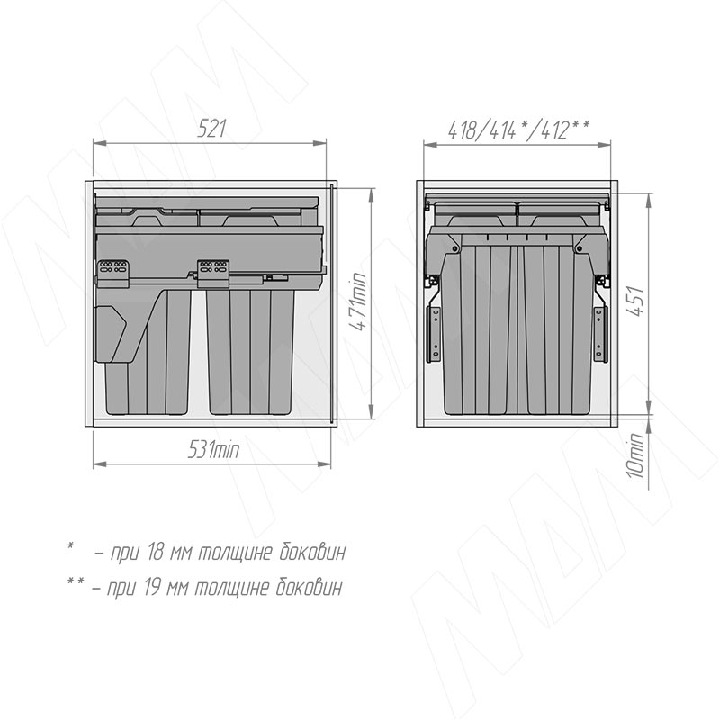 Установка системы PROBOX F45 для сортировки и хранения, 3 емкости (2x13+1x28 л), для фасадов шириной 450 мм (артикул MBN453-54DGMID), схема 1