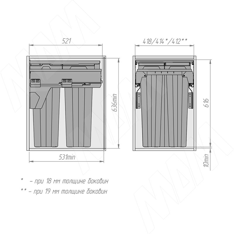 Установка системы PROBOX F45 для сортировки и хранения, 3 емкости (2x16+37 л), для фасадов шириной 450 мм (артикул MBN453-69DGMID), схема 2
