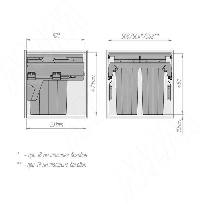 Установка системы PROBOX F60 для сортировки и хранения, 2 емкости (2x28 л), для фасадов шириной 600 мм (артикул MBN452-66DGMID), схема 1