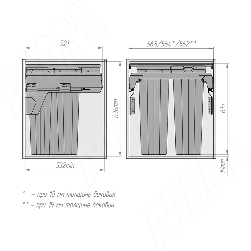 Установка системы PROBOX F60 для сортировки и хранения, 3 емкости (2x16+37 л), для фасадов шириной 600 мм (артикул MBN603-69DGMID), схема 2