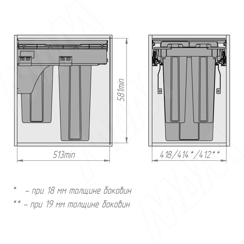 Установка системы PROBOX  LT F45 для сортировки и хранения, 3 емкости (2x9 л +1x27 л), для фасадов шириной 450 мм (артикул BRD453-45HDG), схема 2