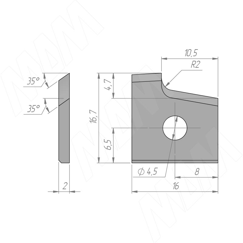 Размеры сменной твердосплавной пластины правой 16x16,7x2 R=2 (артикул 161672R2R-07)