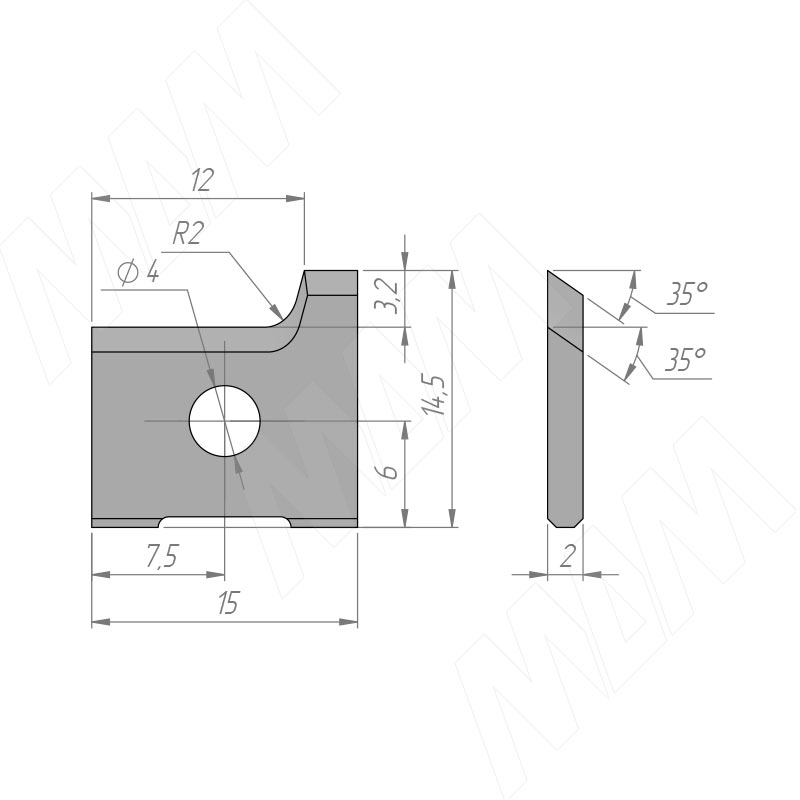 Размеры сменной твердосплавной пластины левой 15x14,5x2 R2 (артикул 151452R2L-07)