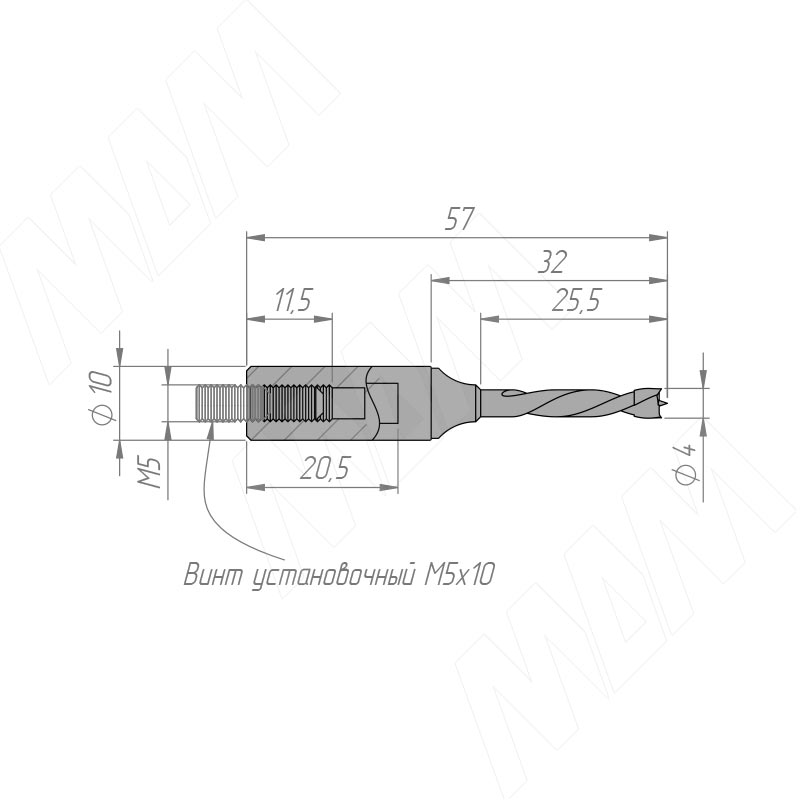 Размеры глухого цельнотвердосплавного сверла D=4 мм, L=57 мм, LH серии Monolit (артикул 1020557)