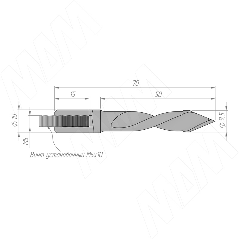 Размеры сквозного сверла, D=9.5мм, L=70мм, LH серия Standard (артикул 11021570)