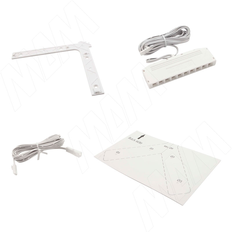 Комплектация: светильник, установочная площадка, шаблон для монтажа, провод-удлинитель для подключения к блоку питания (1000 мм), провод-удлинитель с разветвлителем на 10 портов для подключения светильников без выключателей