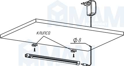 Способ установки: закрепить П-образные клипсы на монтажной поверхности, далее защелкнуть светильник в клипсы