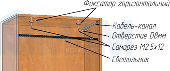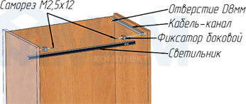 Способ установки и подключения: возможно установить светильник двумя способами: при помощи боковых фиксаторов, которые устанавливаются на боковины короба, далее светильник вставить в фиксаторы; при помощи панельных фиксаторов, которые устанавливаются на верхнюю часть короба, далее светильник вставить в фиксаторы.