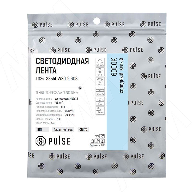 Цветовая температура - холодный белый Рабочее напряжение 24 В Мощность 9,6 Вт на 1 м.п. Количество диодов 120 шт./м Световой поток 765 лм на м Степень защиты IP20 Ширина основания ленты 5 мм