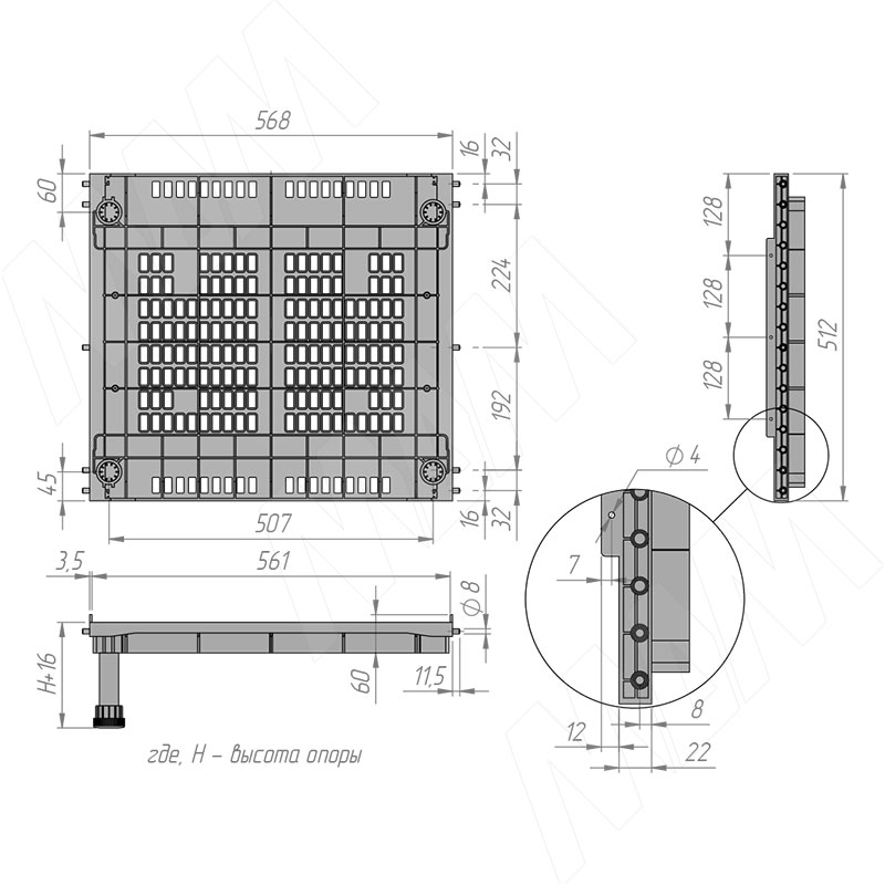 База хороша, но чертёж рисовал парикмахер или кондитер. Какая высота от пола до верхней стороны при применении опор, к примеру, стомиллиметровой длины? Пока не купите - будете пребывать в сомнении. О размерных ошибках писали ранее