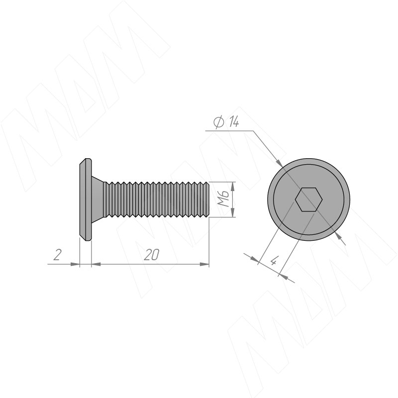 Размер винта М6х20 мм с плоской головкой под шестигранник (артикул HXS M6 X20 FL)