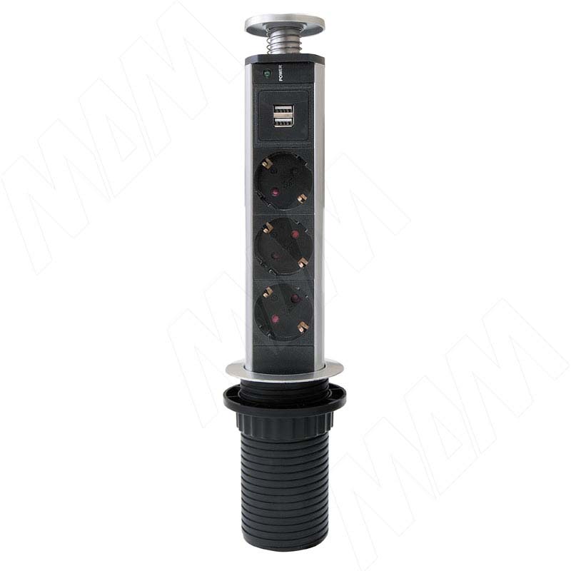 Выдвижной блок розеток, d=60 мм, 3 розетки, 2 USB, серебро