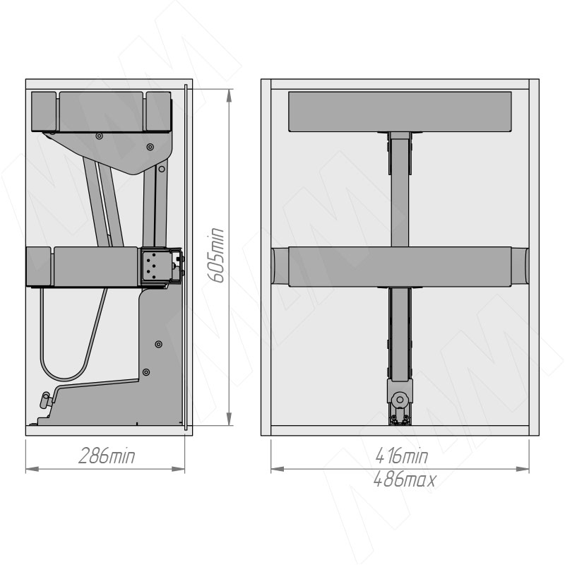 Внимание! Механизм имеет большой вес! Необходимо обязательно рассчитать максимальный вес корпуса с механизмом, фасадами, фурнитурой и полезной нагрузкой для правильного выбора навесов.