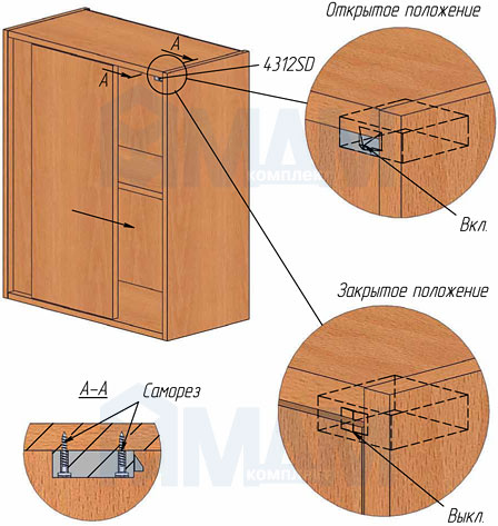 Применение: используется для раздвижного фасада, свет будет включаться при открывании фасада и гаснуть при его закрывании