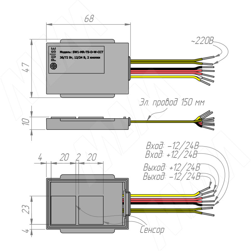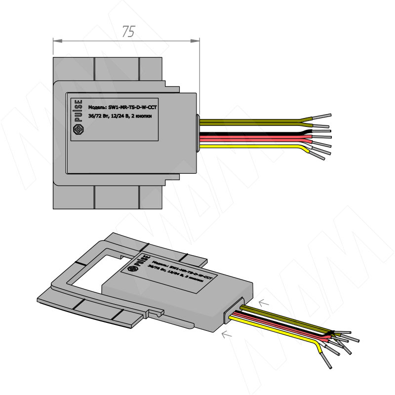 Подключение выключателя для зеркала сенсорного диммируемого с обогревом  для ленты CCT, 2 кнопки, 12/24В (артикул SW1-MR-TS-D-W-CCT), чертеж 4