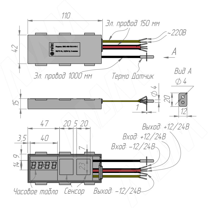 Подключение электрооборудования к сенсорному диммируемому выключателю для зеркала, обогрев, электронные часы, 2 кнопки, 12/24В (артикул SW1-MR-TS-D-W-C)