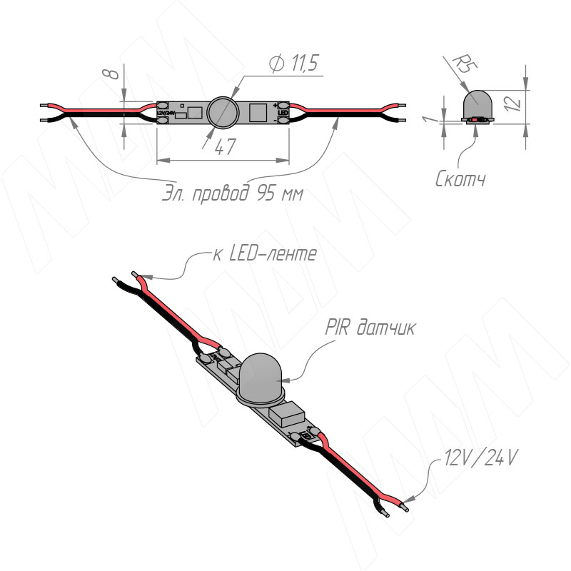 Выключатель с датчиком на движение, для установки в профиль, с проводами 12/24V, 60/120W