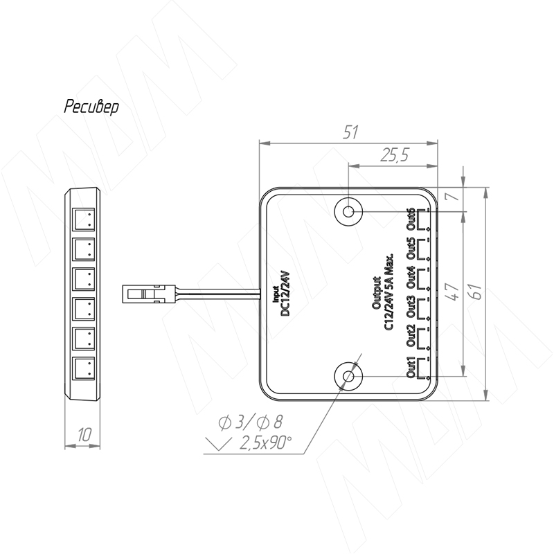 Внимание! Выключатель может работать в напряжении 12 и 24 В, но ресивер и провода оснащены коннекторами для напряжения 12 В. Для подключения светильников и блока питания с рабочим напряжением 24 В необходимо дополнительно приобрести провода-«переходники».