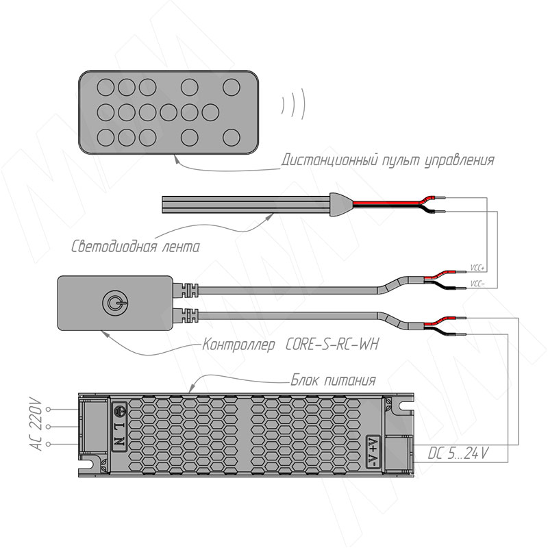 Размеры диммера с пультом ДУ, 2.4Г Гц, для монохромной светодиодной ленты (артикул CORE-S-RC-WH)Подключение диммера с пультом ДУ, 2.4Г Гц, для монохромной светодиодной ленты (артикул CORE-S-RC-WH)