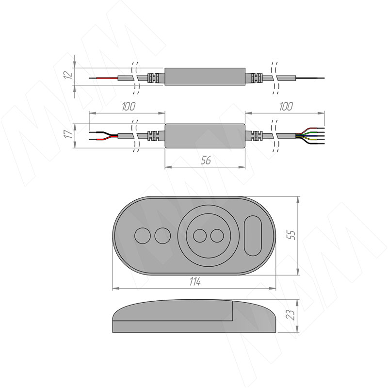 Размеры диммера с пультом ДУ, 433 МГц, для светодиодной ленты RGBW (артикул CORE-ST-RGBW-RC-BL)Подключение диммера с пультом ДУ, 433 МГц, для светодиодной ленты RGBW (артикул CORE-ST-RGBW-RC-BL)