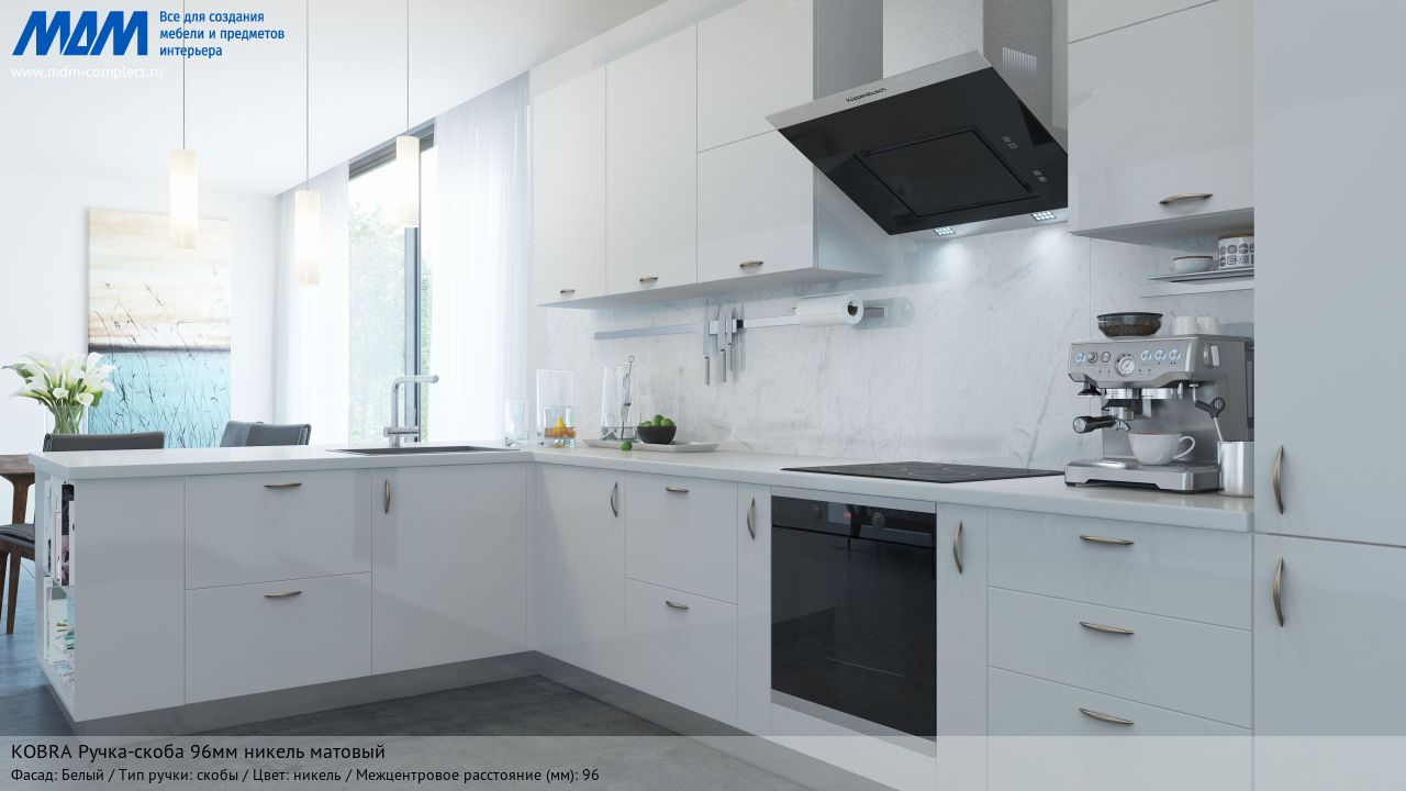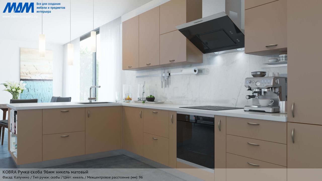 Мебельная kobra ручка-скоба 96мм никель матовый на различных фасадах в кухонном интерьере в стиле модерн.