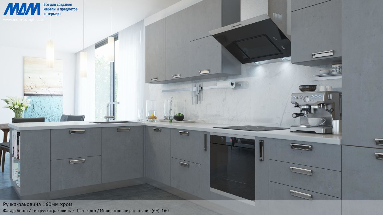 Мебельная ручка-раковина 160мм хром на различных фасадах в кухонном интерьере в стиле модерн.