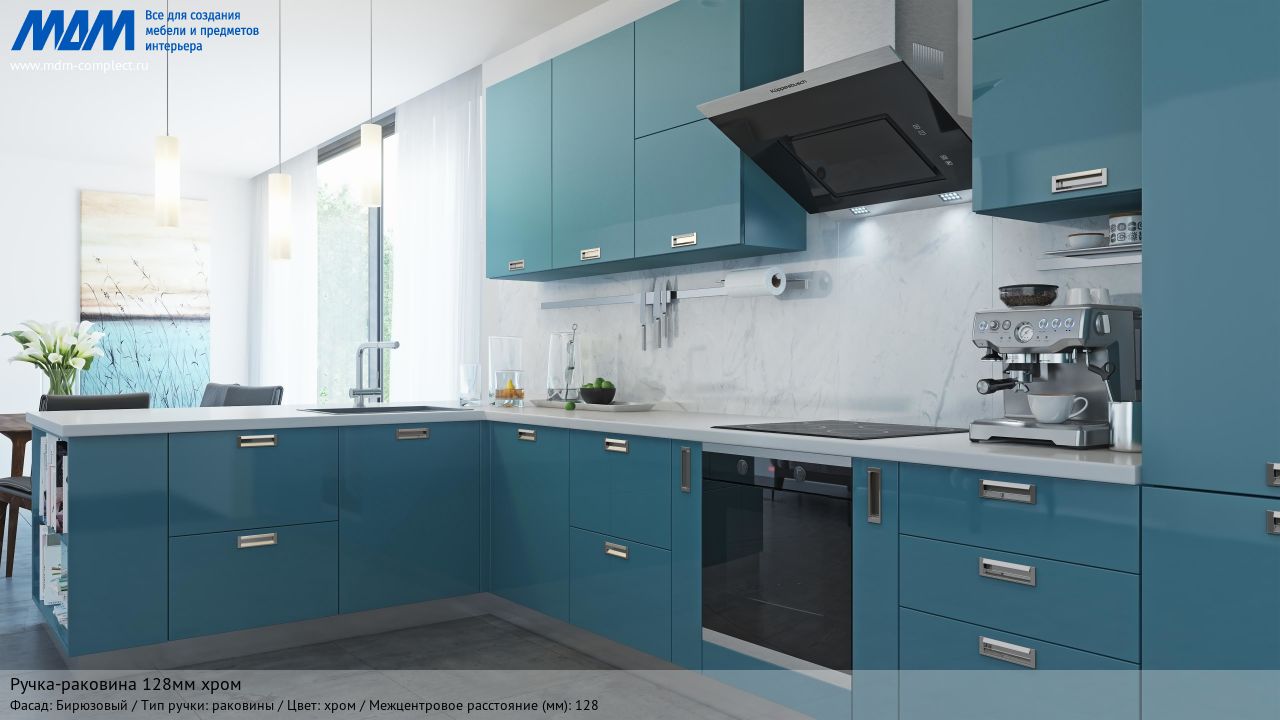 Мебельная ручка-раковина 128мм хром на различных фасадах в кухонном интерьере в стиле модерн.