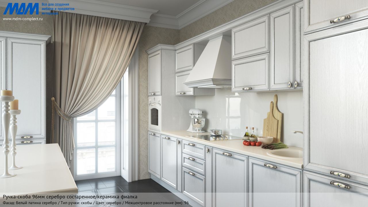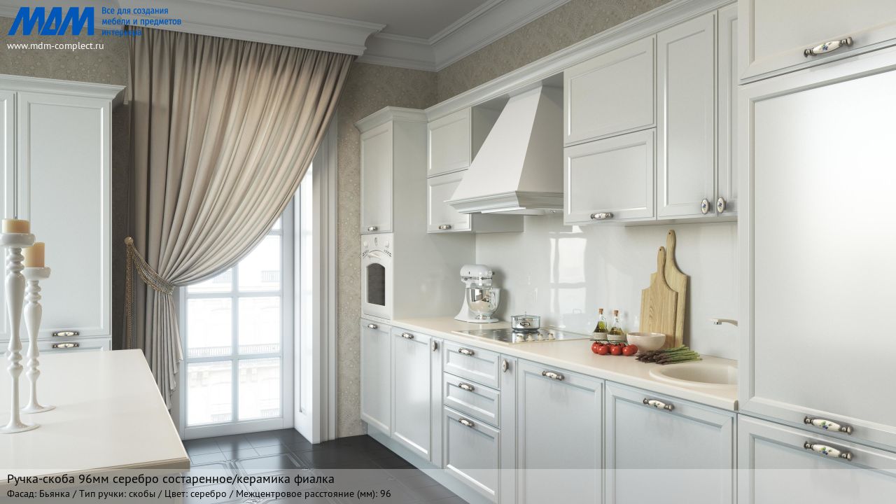 Мебельная ручка-скоба 96мм серебро состаренное/керамика фиалка на различных фасадах в кухонном интерьере в стиле классика.