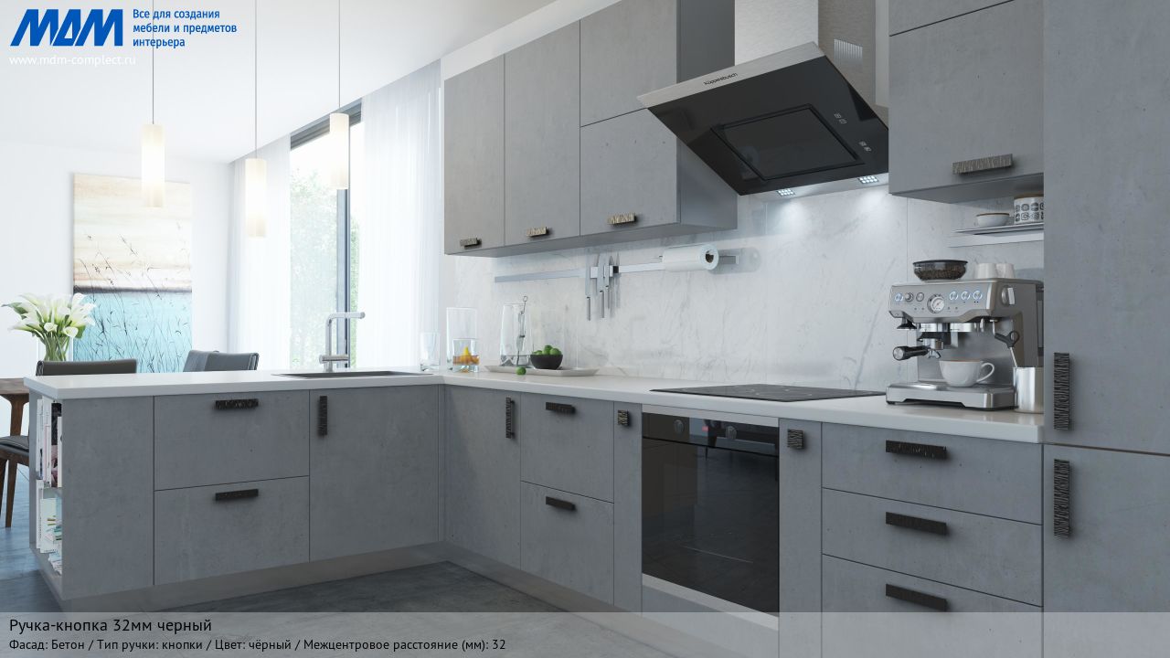 Мебельная ручка-кнопка 32мм черный на различных фасадах в кухонном интерьере в стиле модерн.