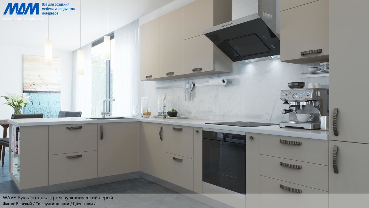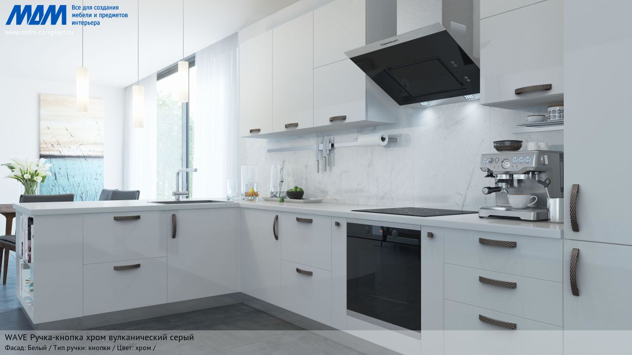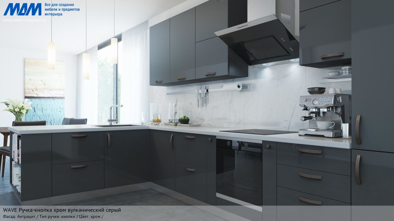 Мебельная wave ручка-кнопка хром вулканический серый на различных фасадах в кухонном интерьере в стиле модерн.
