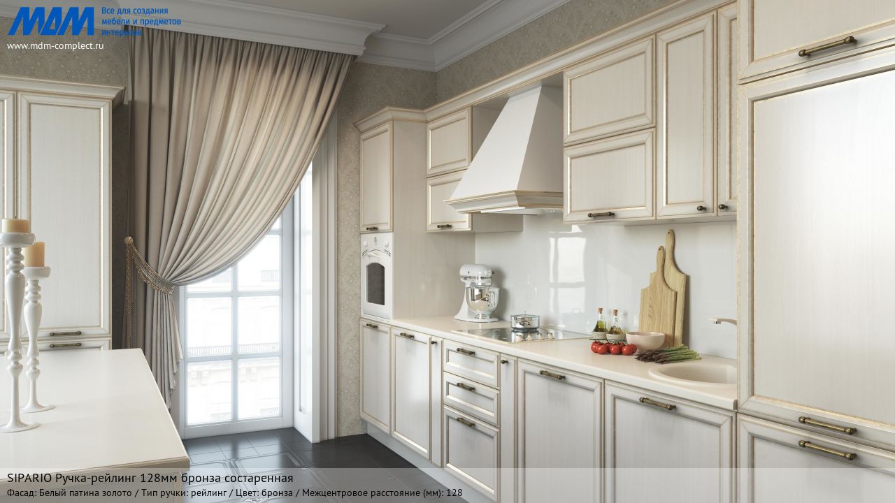 Мебельная sipario ручка-рейлинг 128мм бронза состаренная на различных фасадах в кухонном интерьере в стиле классика.