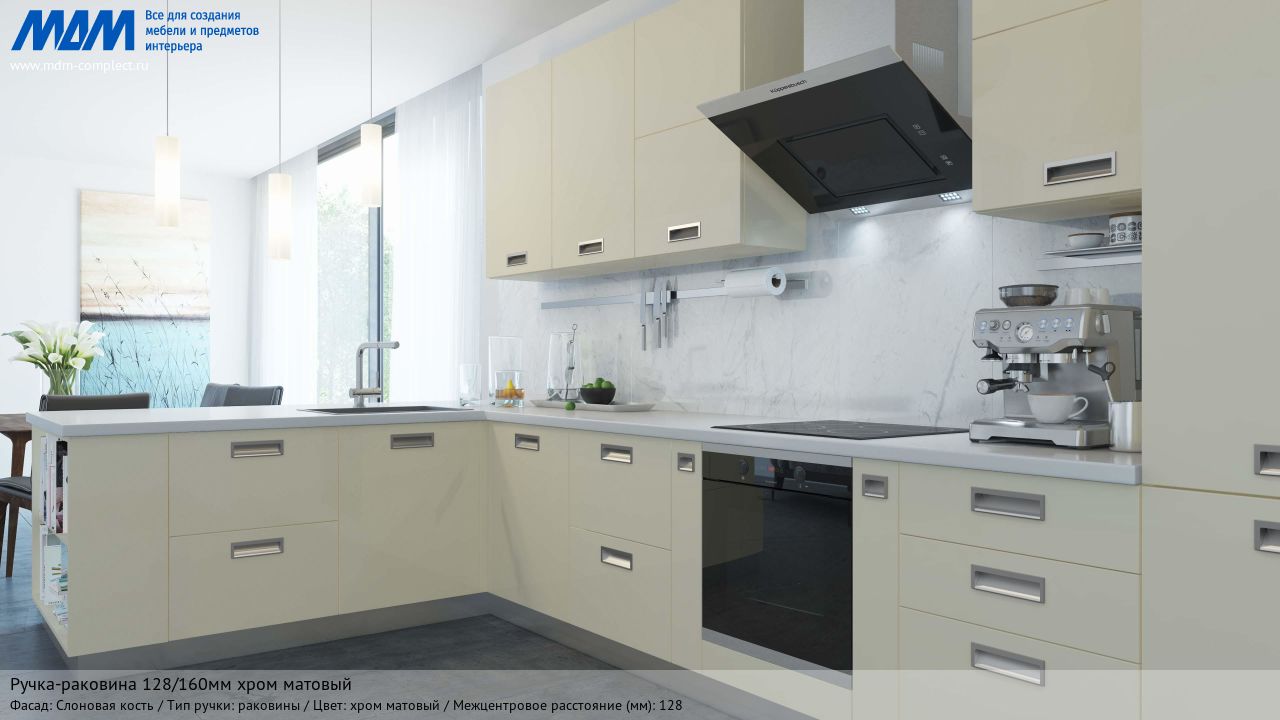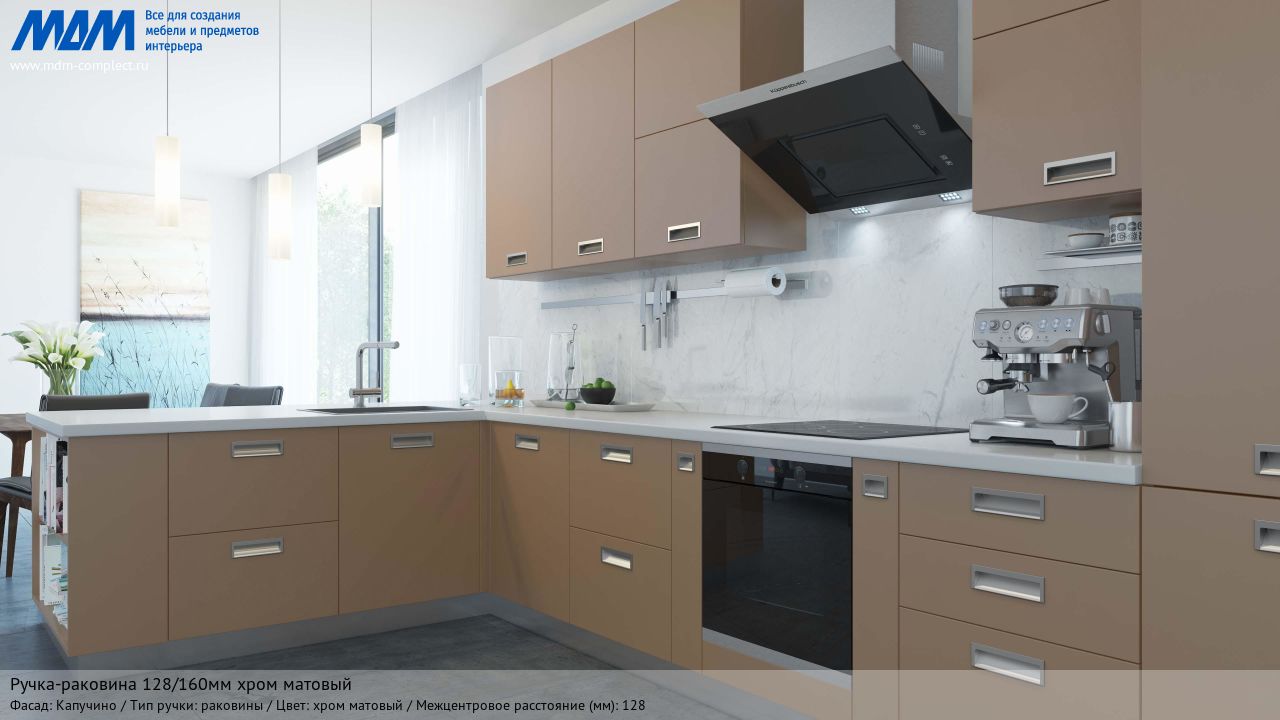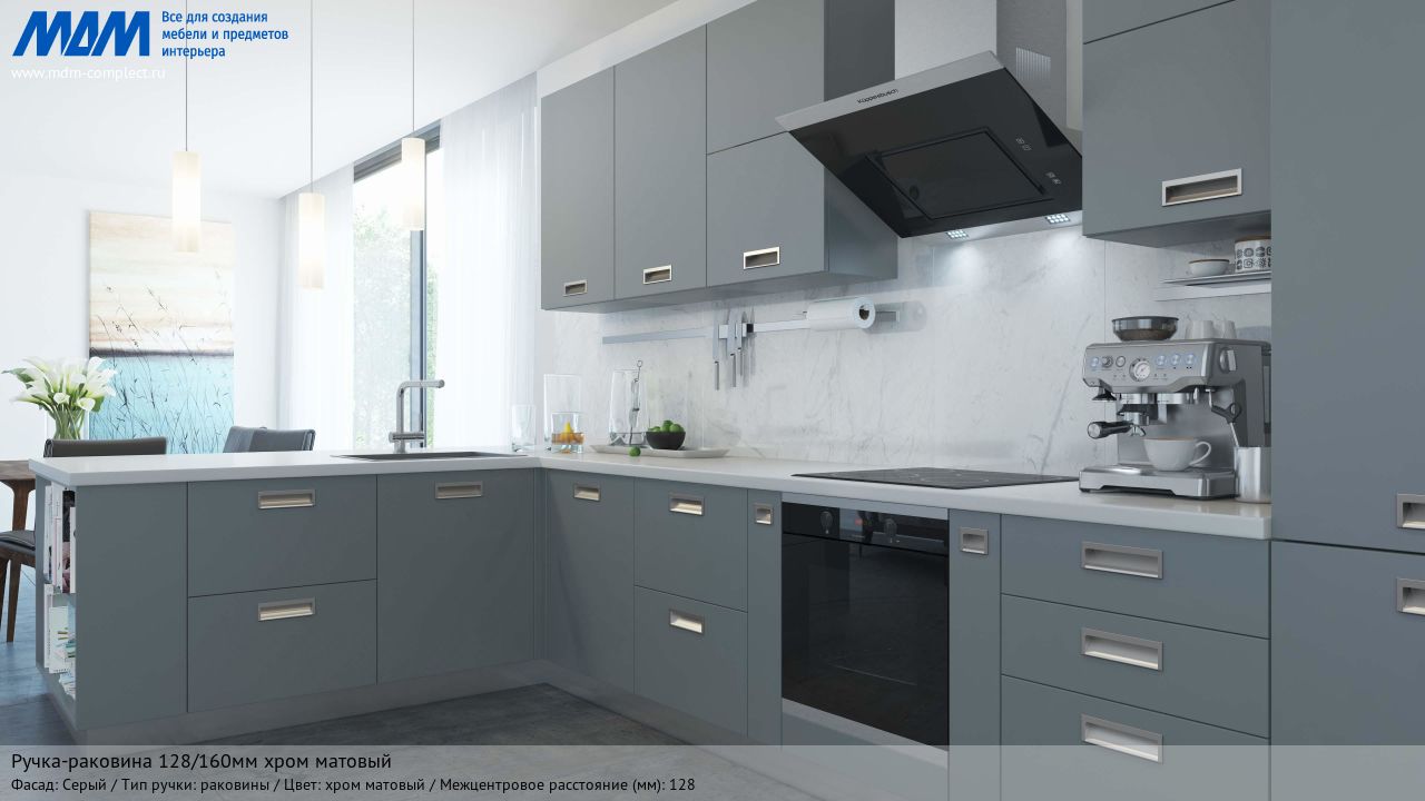 Мебельная ручка-раковина 128/160мм хром матовый на различных фасадах в кухонном интерьере в стиле модерн.