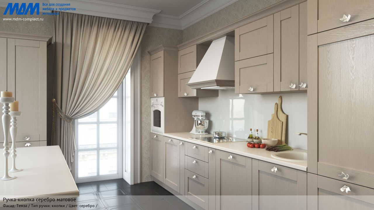 Мебельная ручка-кнопка серебро матовое на различных фасадах в кухонном интерьере в стиле классика.