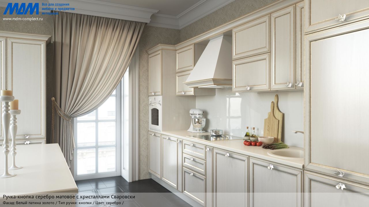 Мебельная ручка-кнопка серебро матовое с кристаллами сваровски на различных фасадах в кухонном интерьере в стиле классика.