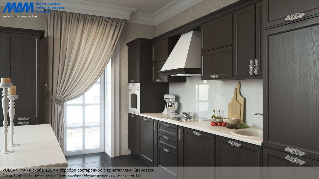 Мебельная vulcan ручка-скоба 128мм серебро состаренное с кристаллами сваровски на различных фасадах в кухонном интерьере в стиле классика.