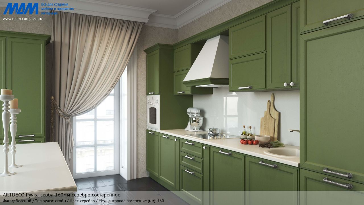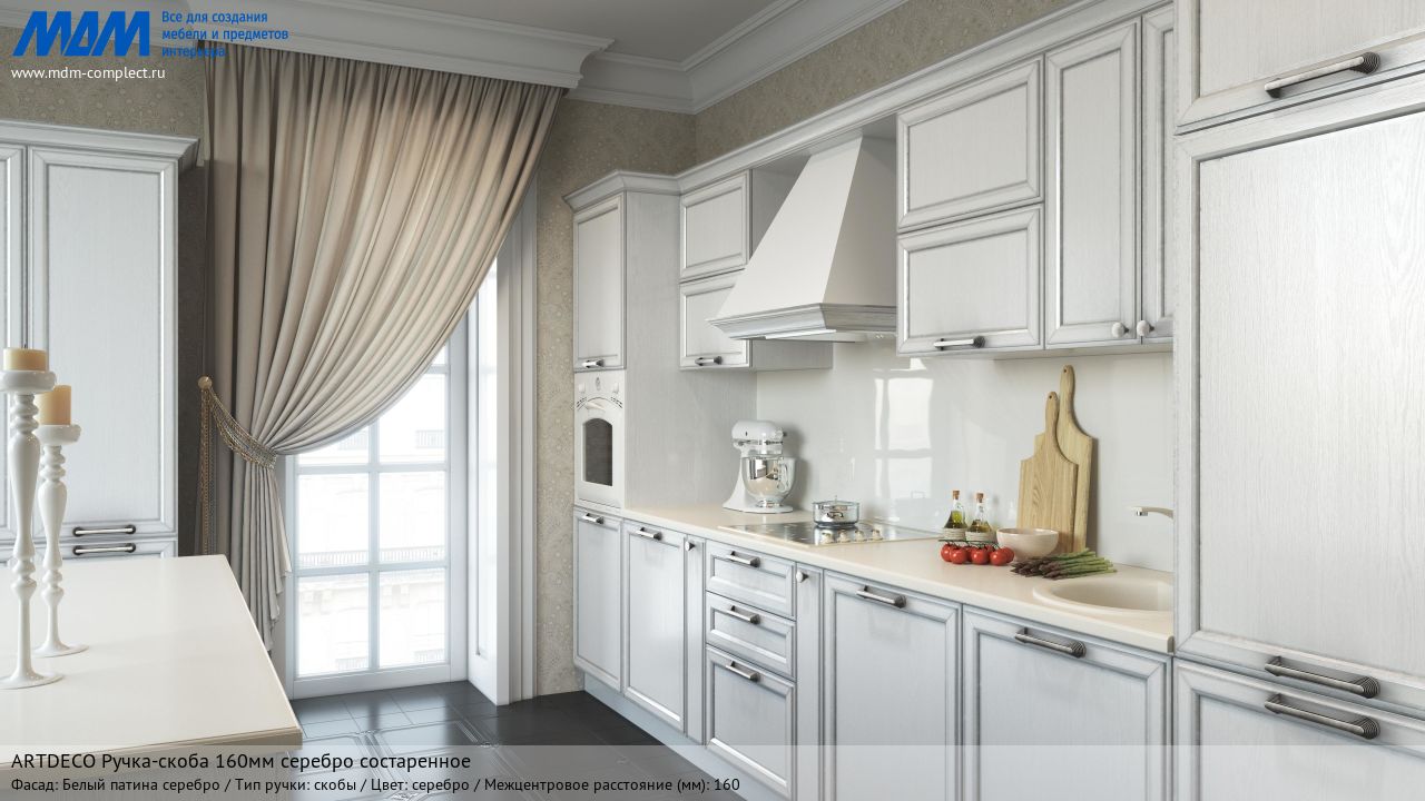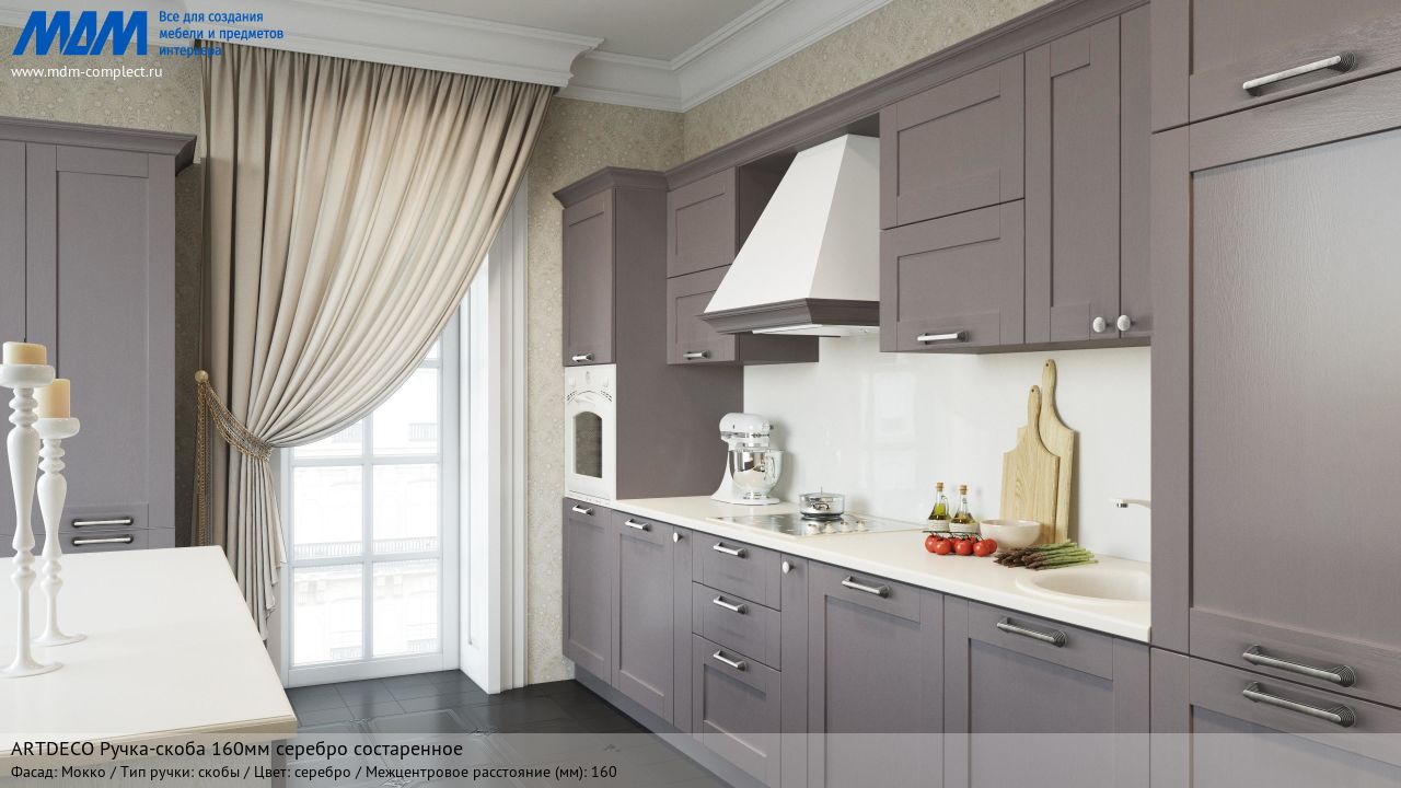 Мебельная artdeco ручка-скоба 160мм серебро состаренное на различных фасадах в кухонном интерьере в стиле классика.