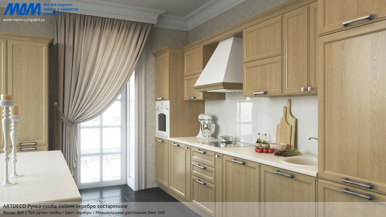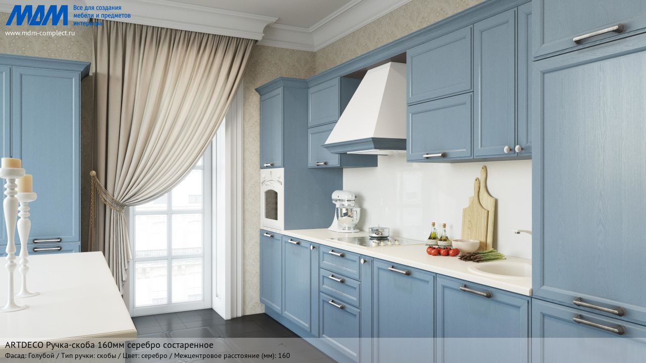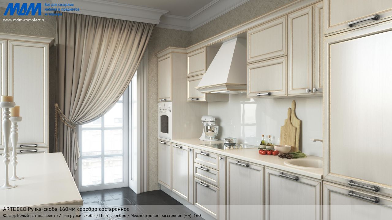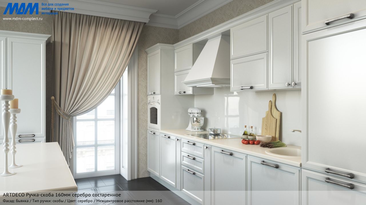 Мебельная artdeco ручка-скоба 160мм серебро состаренное на различных фасадах в кухонном интерьере в стиле классика.